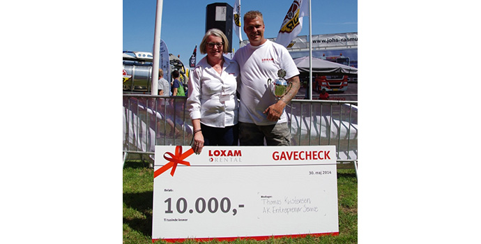 Thomas Kristensen vandt DM i minigraver. Her lykønskes han af adm. direktør for LOXAM Danmark Hanne Baunsgaard.