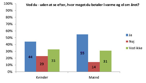 Til gengæld ser det ud som om, at mændene er mere bevidste om, hvordan husstandens varme, el og strømforbrug ser ud. Hver anden danske mand, der har deltaget i undersøgelsen, kan på stående fod svare på, hvordan tallene ser ud fra det sidste årsregnskab, hvorimod det kun er hver tredje kvinde, der kender tallene. Undersøgelsen viser også, at jo ældre man bliver, jo bedre fornemmelse har man for størrelsen af sine energiudgifter – måske slår erfaringen igennem, når de høje regninger skal betales?