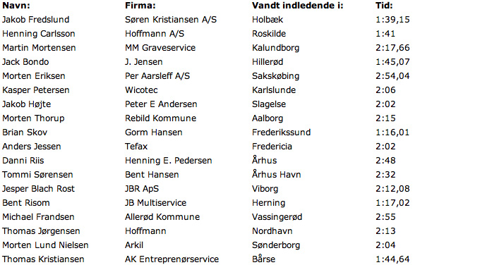 Deltagerne i finalen ved DM for minigraver 2013 er vinderne fra de indledende runder, som netop er holdt 19 forskellige steder i landet: