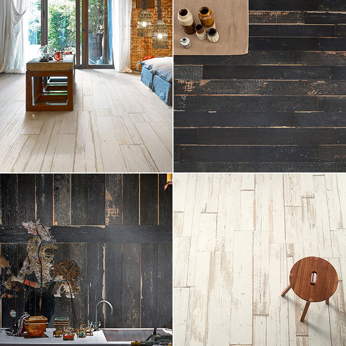 Skøn gulv- og vægflise der allerede har den skønne patina af slidt trægulv.