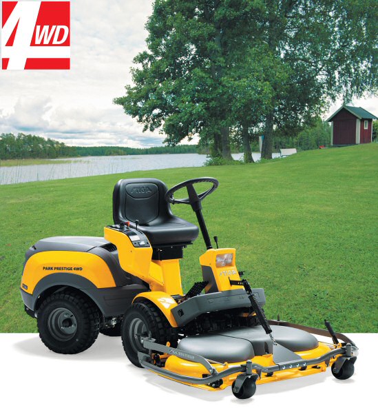 Udviklingsarbejdet har koncentreret sig om at gøre maskinen fleksibel og let at manøvrere. Stiga har igen taget et skridt ind i fremtiden: Med Stiga Park Prestige 4WD er det meste muligt. Maskinen kan køre op og ned af våde bakker, uden at glide eller lave hjulspor i græsplænen.