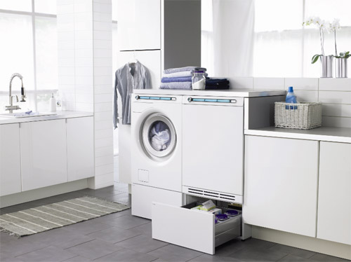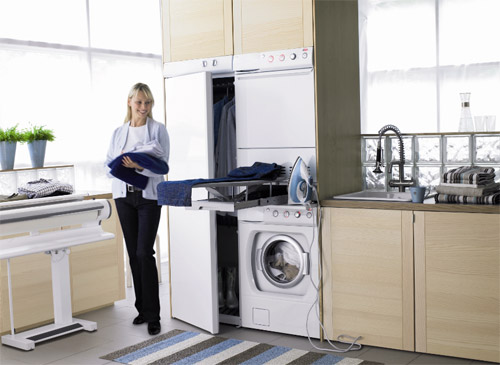 I den elegante løsning udnytter man maskinernes enkle og flotte design og bruger det som en udsmykning af rummet, for eksempel kombineret med vaskeriskuffer, hvor strygebræt og vaskemidler nemt gemmes af vejen.