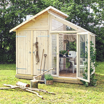 Nu er det ikke længere nødvendigt at kæmpe for at lirke græsslåmaskinen på tværs ind i redskabsskuret. Det er også slut med indelukkede, klemte fornemmelser og manglende overblik over havens redskaber og andre hengemte ting. I redskabsskuret, der er forbundet med det lille drivhus, kan hele den ene gavl nemlig åbnes, da skuret er designet med en funktionel dobbeltdør. På den måde er det let og overskueligt at åbne op og danne overblik over alle de gemte sager, når haven skal gøres forårsklar.