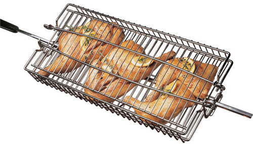 Bruges en grillkurv (Can-Scan har en god en af slagsen varenr. 50514) , skal den først pensles godt med olie inden den tages i brug. Læg kyllinge-stykkerne i bunden og læg top på. Pres godt ned og stram skruerne på kurven. Grillristen fjernes for at gøre plads til kurven og en dryppande med lidt vand, sættes ind under kurven. Bruges bag brænderen skal den stå på max. Bruges bundbrænderen, skal den stå på medium. Sæt kurven i holder og motor, og start. Kyllingevingerne grilles til der er gyldent brun, ca. 45-60 min. Steges kyllingevingerne på grillristen, skal den først pensles godt med olie hvorefter der grilles ca. 35-45 min ved lav varme. Husk at vende kyllingevingerne flere gange til de er gyldne brune på begge sider.