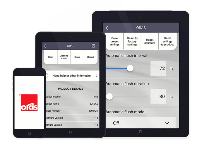 Ved at bruge Oras App reduceres arbejdet og den tid, der er nødvendig for at justere de forskellige funktioner i de elektroniske armaturer betydeligt. Med App kan du få øjeblikkelig adgang til produktinformation, justere, oprette og overføre indstillinger. Få overblik over aktuelle indstillinger på armaturerne, samt dokumentere og rapportere de foretagne justeringer – alt sammen med få fingerbevægelser. Desuden kan du nemt følge blandt andet vandforbrug, den resterende batterilevetid, tid til næste automatiske skyl samt se en kalender over automatisk skylning.