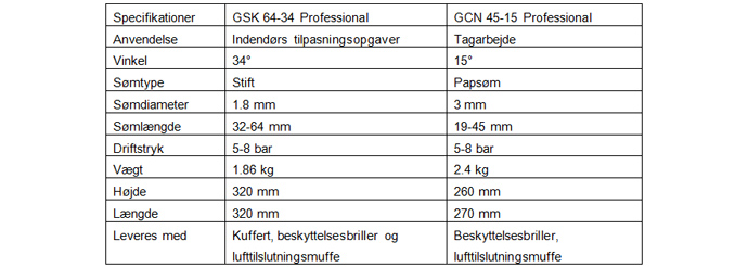 GSK 64-34 Professional er en dykkerpistol, der giver perfekt resultat ved indendørs arbejde fx opsætning af paneler, lofter og fodlister. Den kan håndtere op til 64 mm lange søm i en vinkel på 34°. GCN 45-15 Professional er til udendørsarbejde, fx taglægning, og man kan tilpasse arbejdstrykket mellem 5-8 bar alt efter, om man arbejder i hårdt eller blødt træ. Den skyder op til 45 mm lange søm præcist ind hver gang.